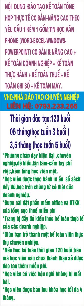 Trung tâm kế toán VHQ là trung tâm chuyên làm dịch vụ kế toán, tư vấn thuế và đào tạo kế toán thực hành thực tế.Học xong cam kết làm được ngay.Mọi chi tiết xin liên hệ: