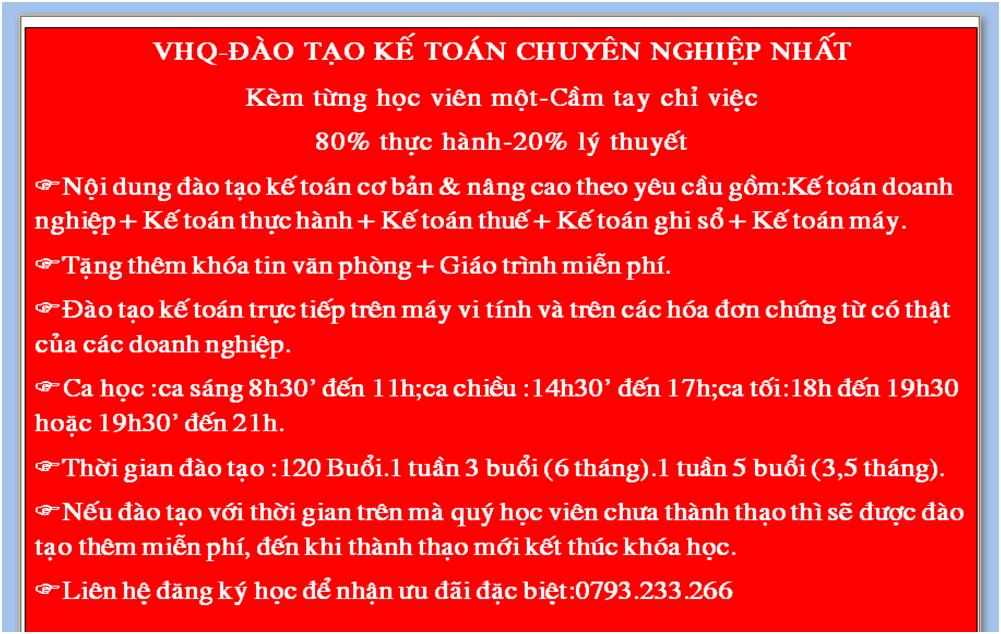 Hãy đến với Chúng tôi – Chi nhánh Trung tâm đào tạo kế toán tại An Dương Hải Phòng của trung tâm VHQ với thương hiệu đào tạo uy tín trên 10 năm giảng dạy trong lĩnh vực kế toán thực hành thực tế chúng tôi cam kết - “KHÔNG THÀNH NGHỀ TRẢ LẠI HỌC PHÍ”